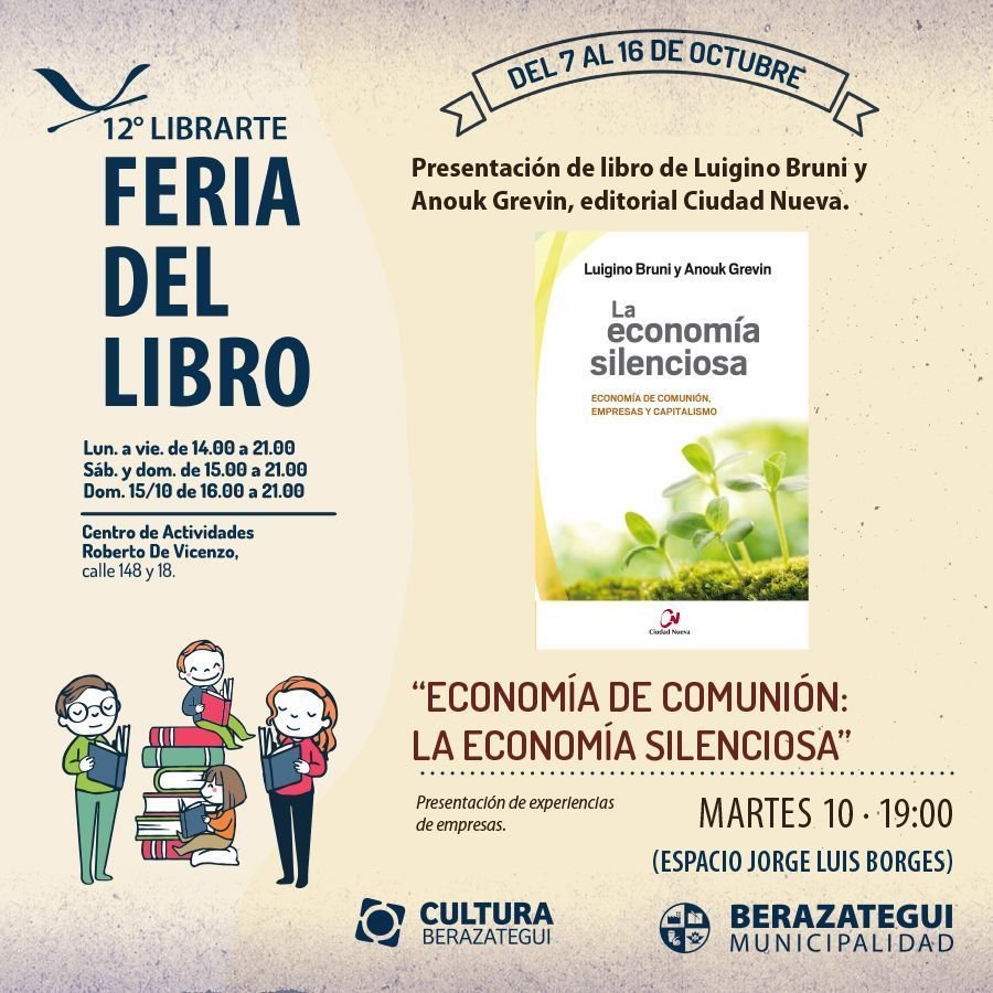 El sábado 7 de octubre a las 15 horas quedará inaugurada la 12° Feria del Libro de Berazategui «Librarte» en el Centro de Actividades Deportivas, Culturales y Recreativas «Roberto De Vicenzo» sito en calle 148 y 18. La entrada es libre y gratuita y permanece abierta hasta las 21 horas. De lunes a viernes abrirá a las 14 y sábados y domingos a las 15 horas. Editorial Ciudad Nueva ocupará el stand 19.